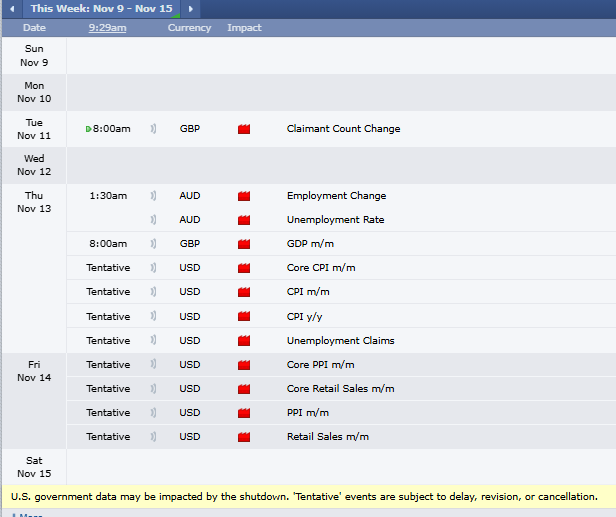 Here are this weekβs red folder news events. The US Government shutdown continues, so lots of βtentativeβ events on the calendar again. What would have been a huge week of inflation numbers, is now a very thin week of data.