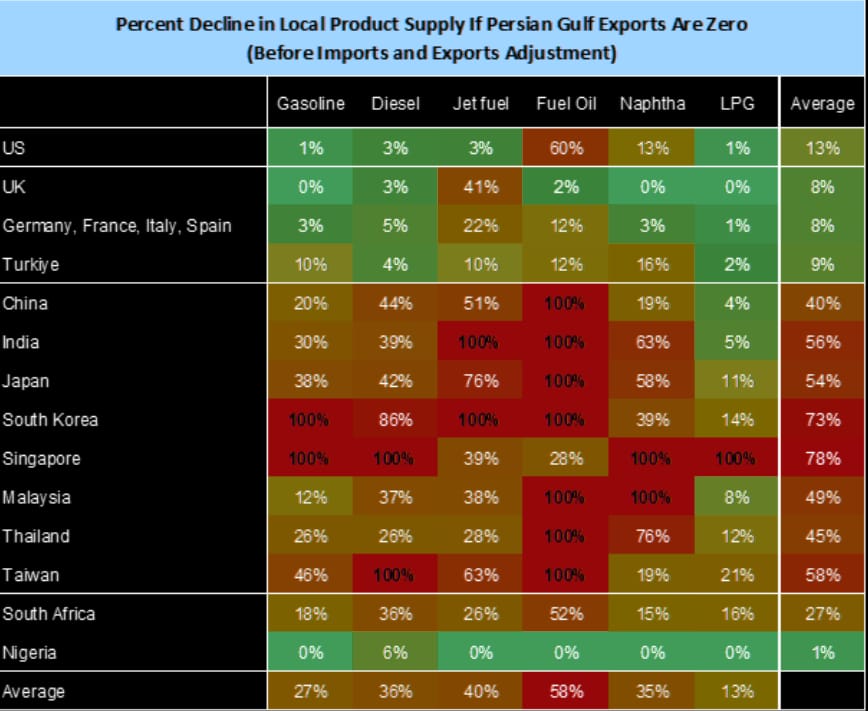 Interestingly, although the UK as very low oil reveres, they are not greatly exposed to the Hormuz closure, with the exception of Jet Fuel. The countries with the highest exposure are Asian countries, and most of them are exposed in a big way.