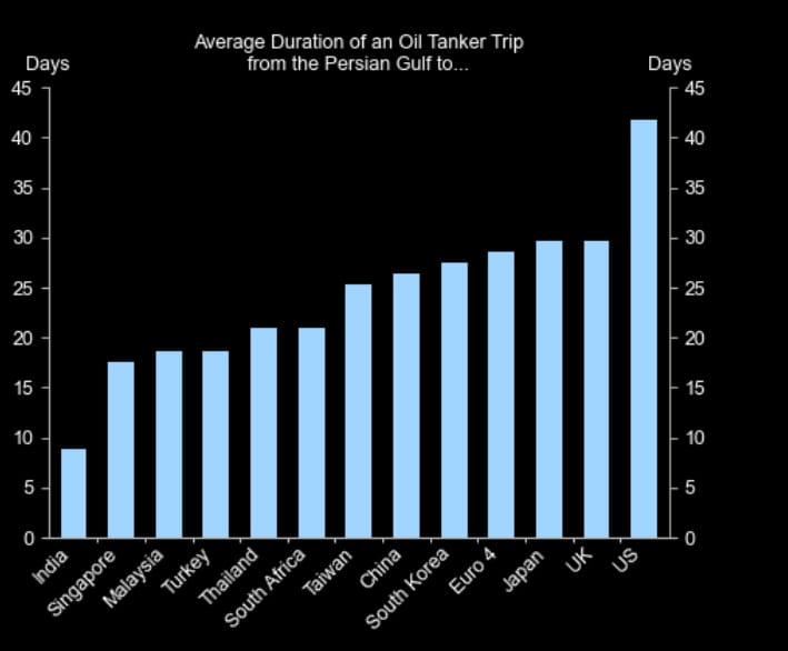 If the Strait reopens, how long for oil tankers to reach countries?