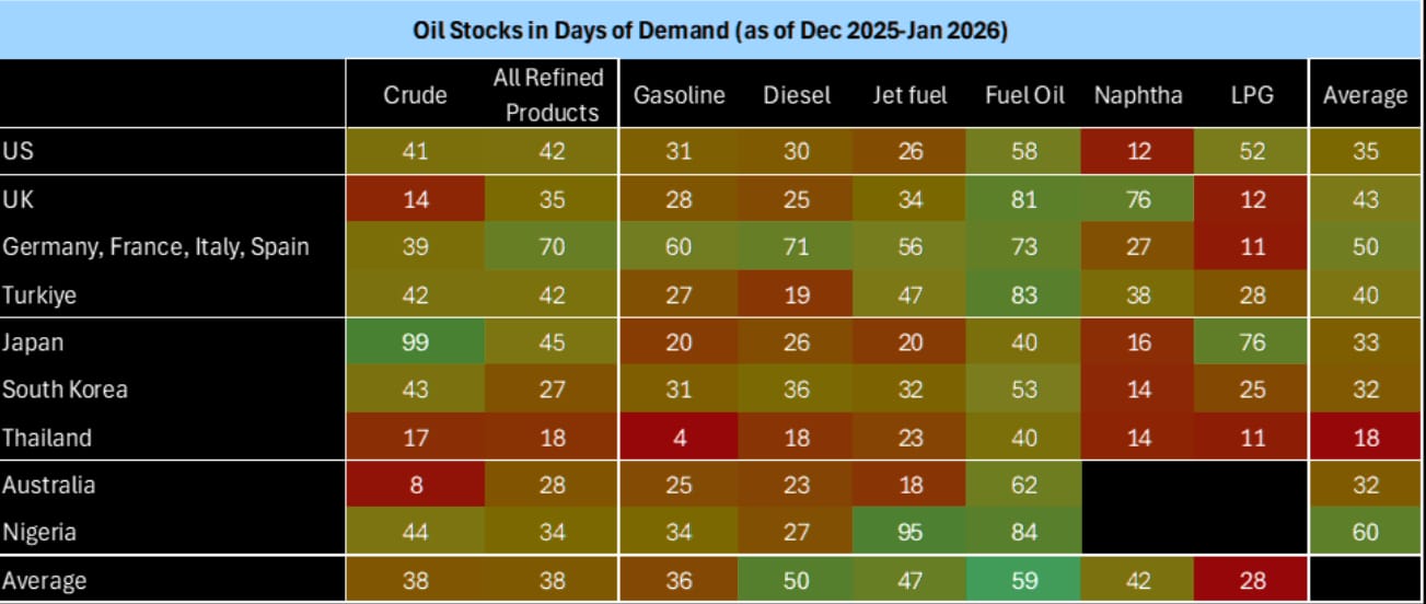 About a month’s worth of reserves on average. European LPG and UK’s 14 days of crude oil reserves are crazy low.