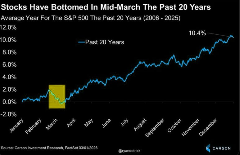 Been tracking this the past few weeks. Historically in March, the stock market sweeps the low of the year and breaks out. Given the current market conditions, we might look back at this moment as the decisive point in the year.